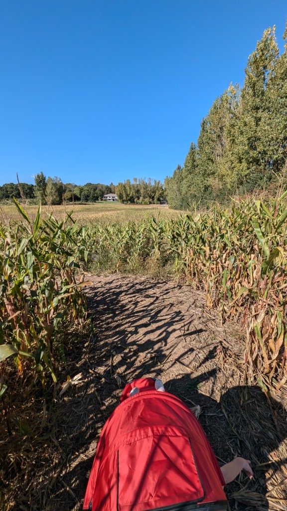 It was the first time we got to use the all-terrain wheels for the Josi Stroller. Dad said they work well. It was easier to roll over the rough ground and corn stalks. Even the corn cobs on the path. The front wheel not so much. We used the wheel that turns cause we weren’t gonna be running. Not even walking fast so no jogging wheel.