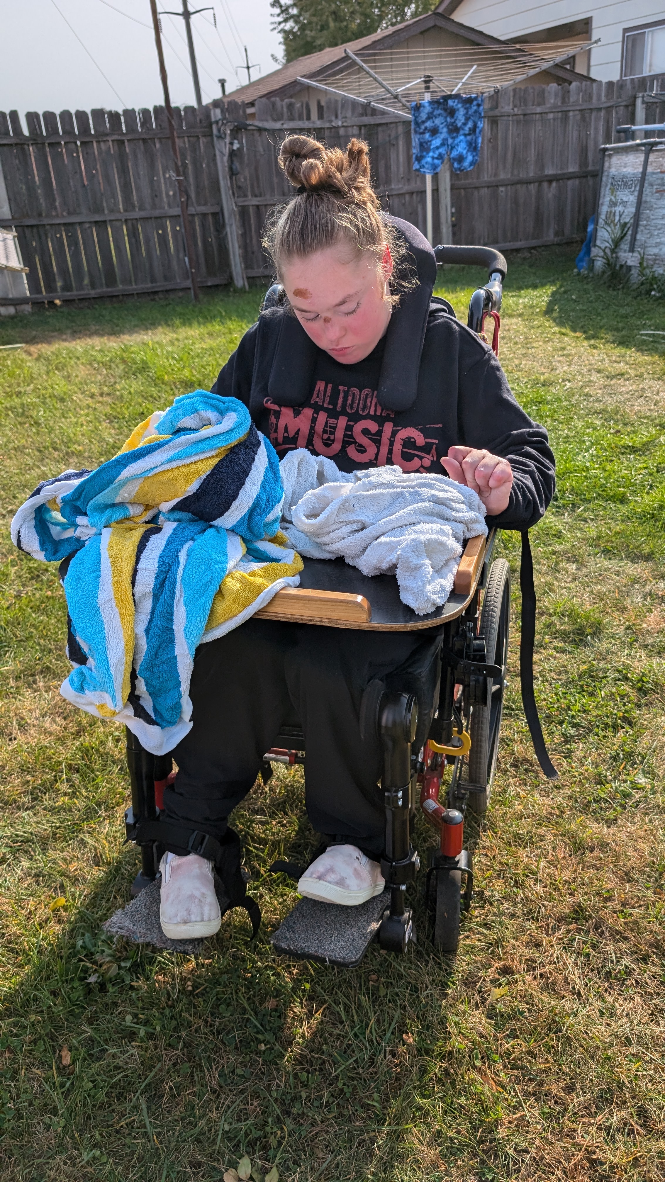 Christina was like a machine today. Hang clothes on the line. Fold laundry already washed and dried. Take clothes off the line. Put clothes away.