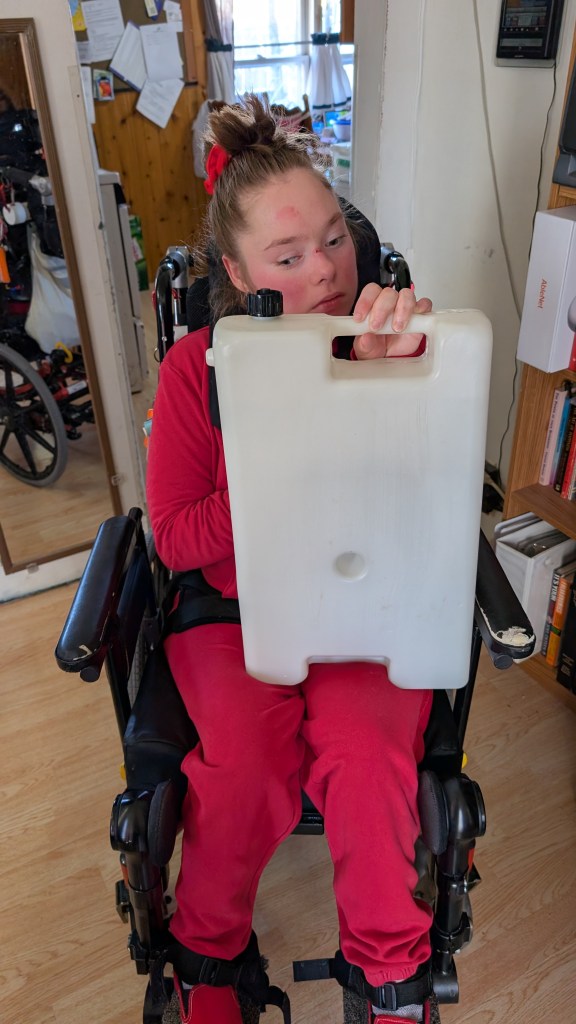 I carry the water container to the kitchen and then back to the living room after it is full. Getting the humidifier in the house and setting it up is one of the things we did this morning.