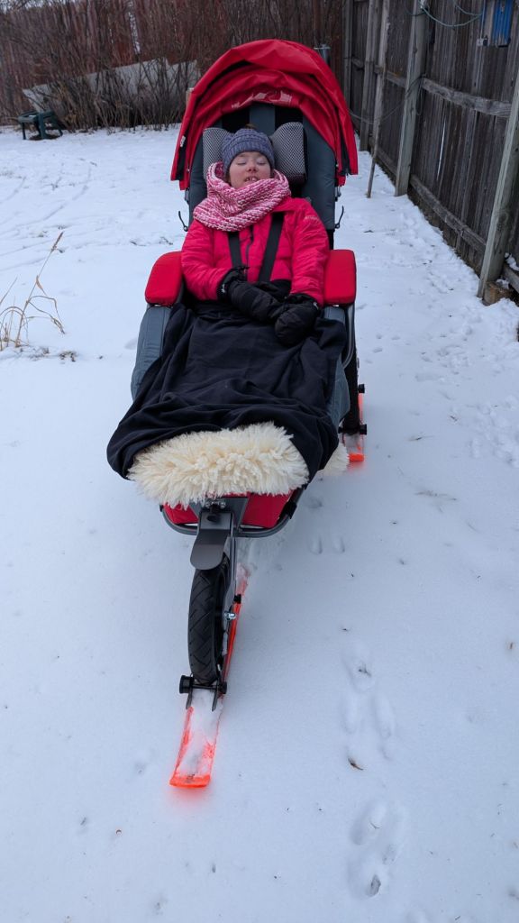 We have a little snow in the backyard. Dad was anxious to try the skis on the Josi stroller. So, after we got back from our walk dad put the skis on and pushed me around the backyard. He was surprised how easy the stroller pushed. He did say that it would be much easier to push if there was more snow. And turning was a little bit of a challenge not having enough snow. I wasn’t really thrilled about trying the skis cuz I was a little cold and ready to go inside.