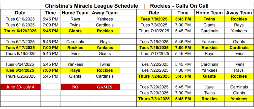 Here is the schedule for the 2025 Miracle League season. Christina is on the Rockies sponsored by Call On Call. Her games are highlighted.
